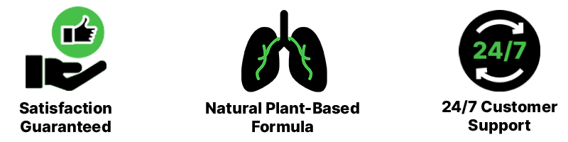 Our natural formula quickly and safely clears mucus and pollutants from the lungs, delivers much-needed oxygen to the lung cells, relieves symptoms of chronic bronchitis, COPD, asthma, reduces coughing and wheezing, prevents shortness of breath, and restores normal breathing.